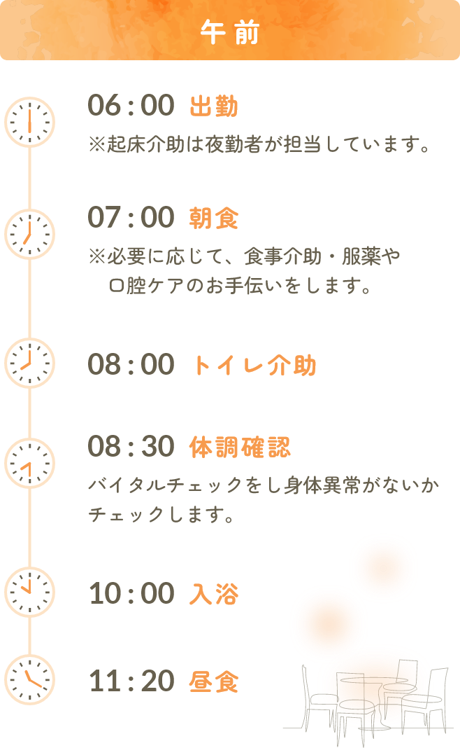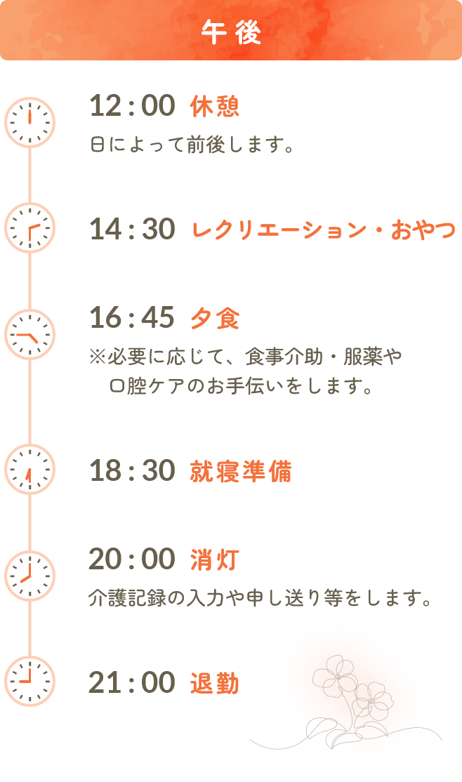 6:00~15:00 / 9:00~18:00 / 12:00~21:00の3交代制です。(1時間休憩あり)